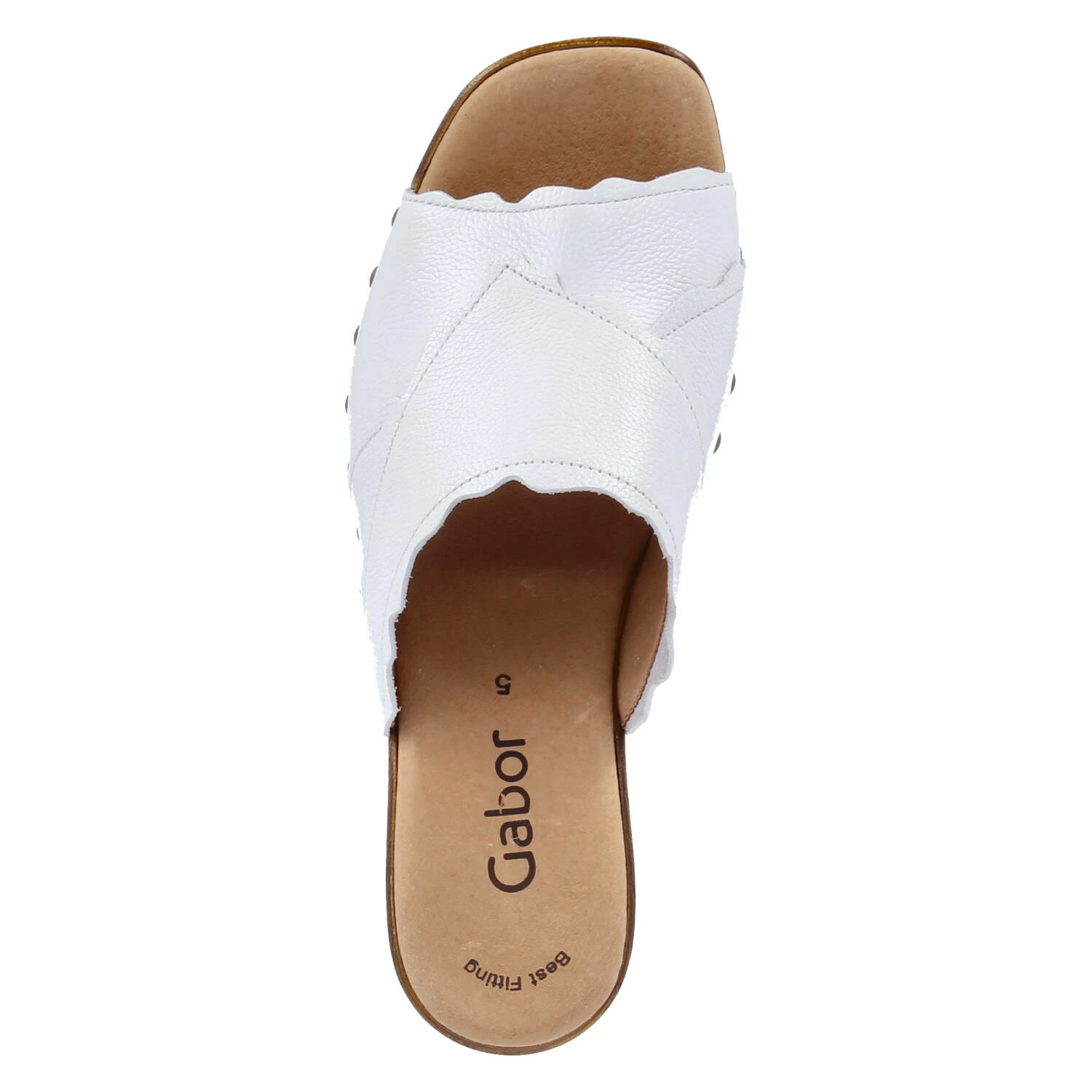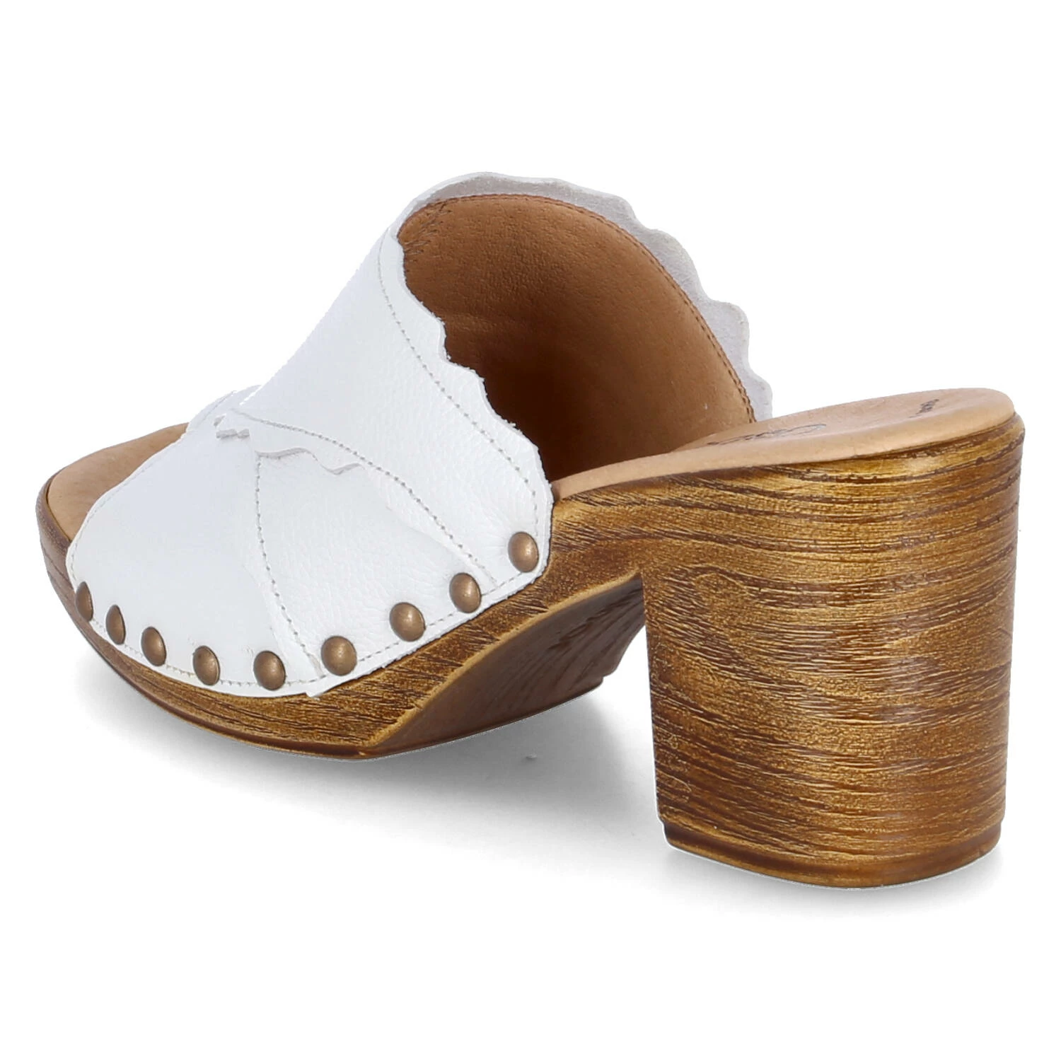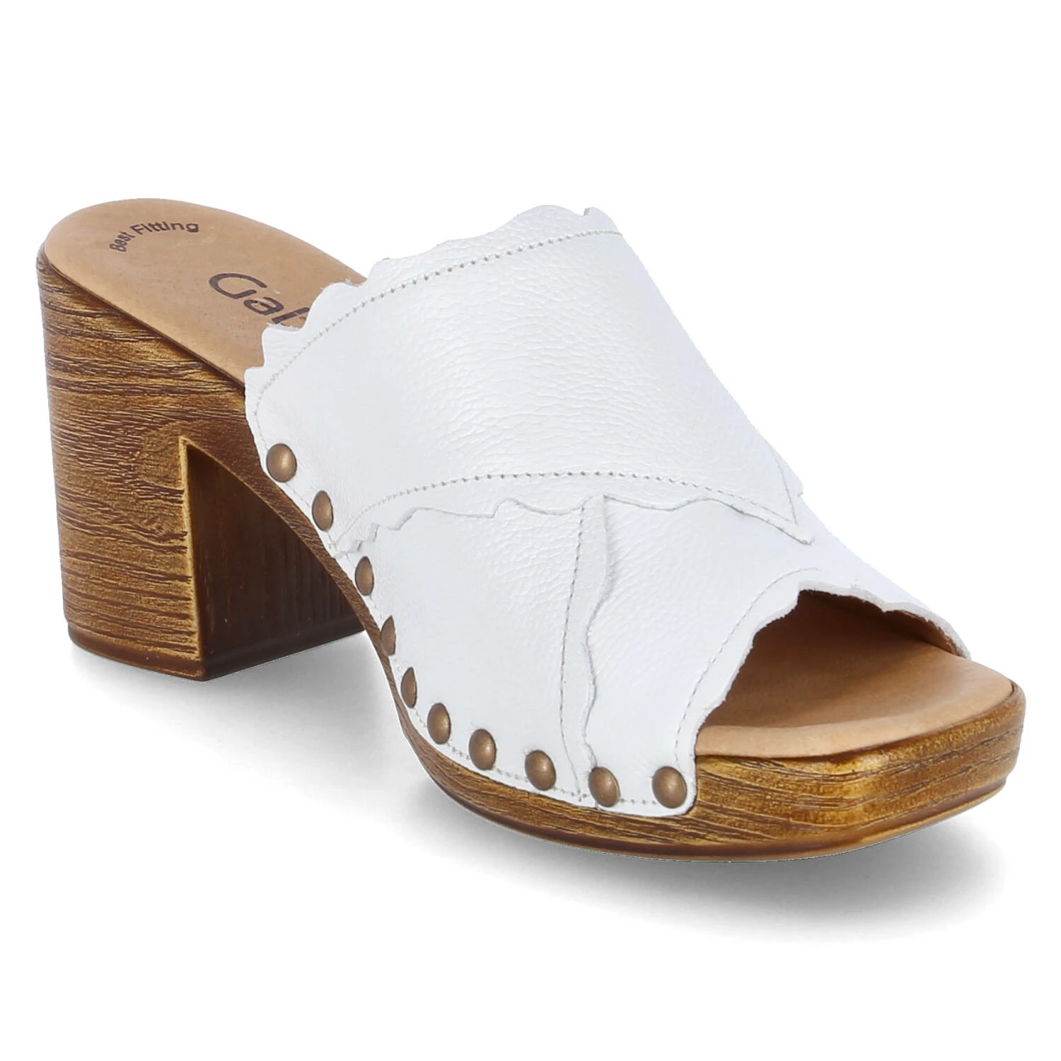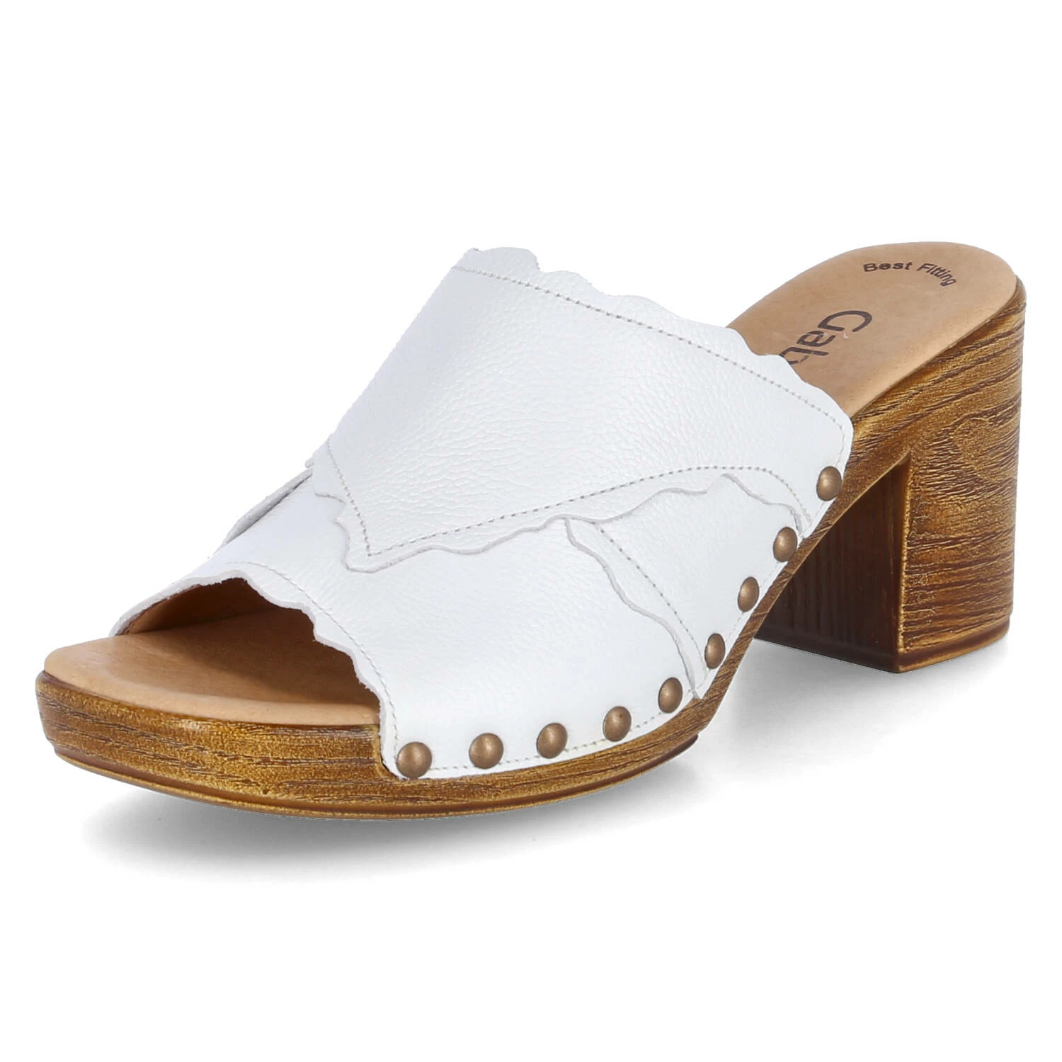 Gabor Damen Mules/ Pantoletten/ Open Toe Clogs Weiß Glattleder – Oberfläche mit überlappenden Lagen und seitlichen Rundnieten – leicht gepolsterte, vorgeformte Lederdecksohle – stabile Laufsohle mit Blockabsatz in Holzoptik