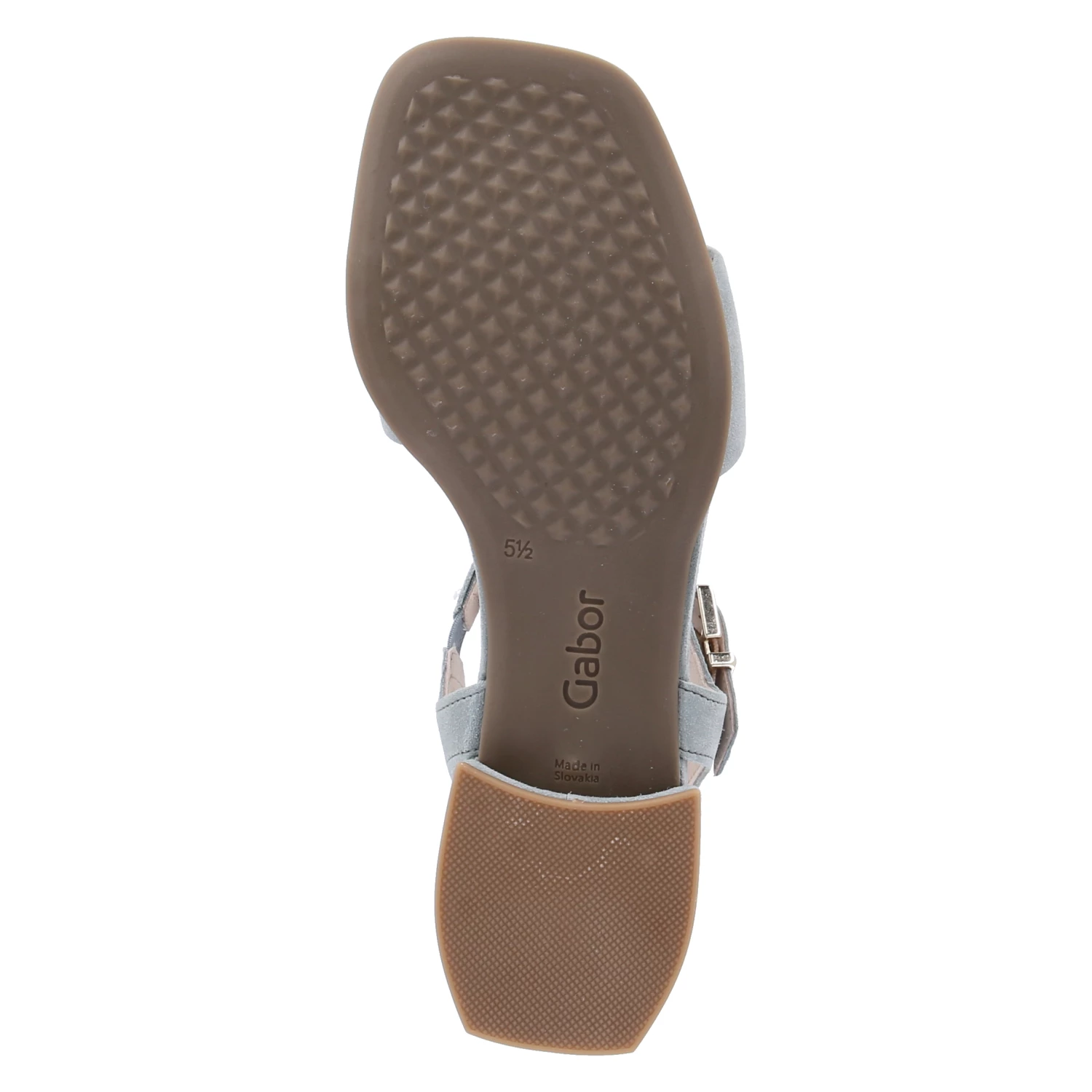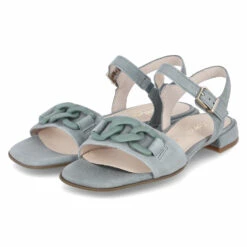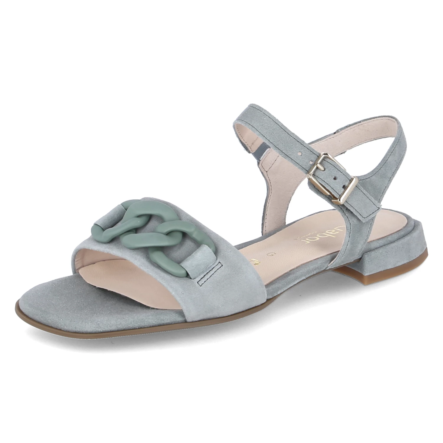 Gabor Damen Sandaletten/ Sandalen Grün Rauleder – vorderer Riemen mit Kettenelement – Knöchelriemen mit Schnalle und Elastikeinsatz – leicht gepolsterte Lederdecksohle – flexible, rutschhemmende Laufsohle – kleiner Blockabsatz
