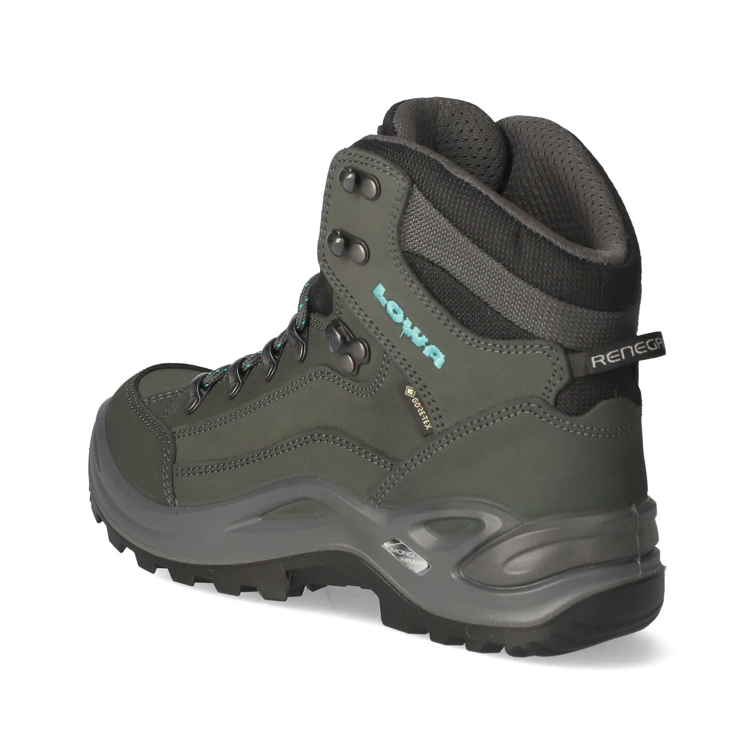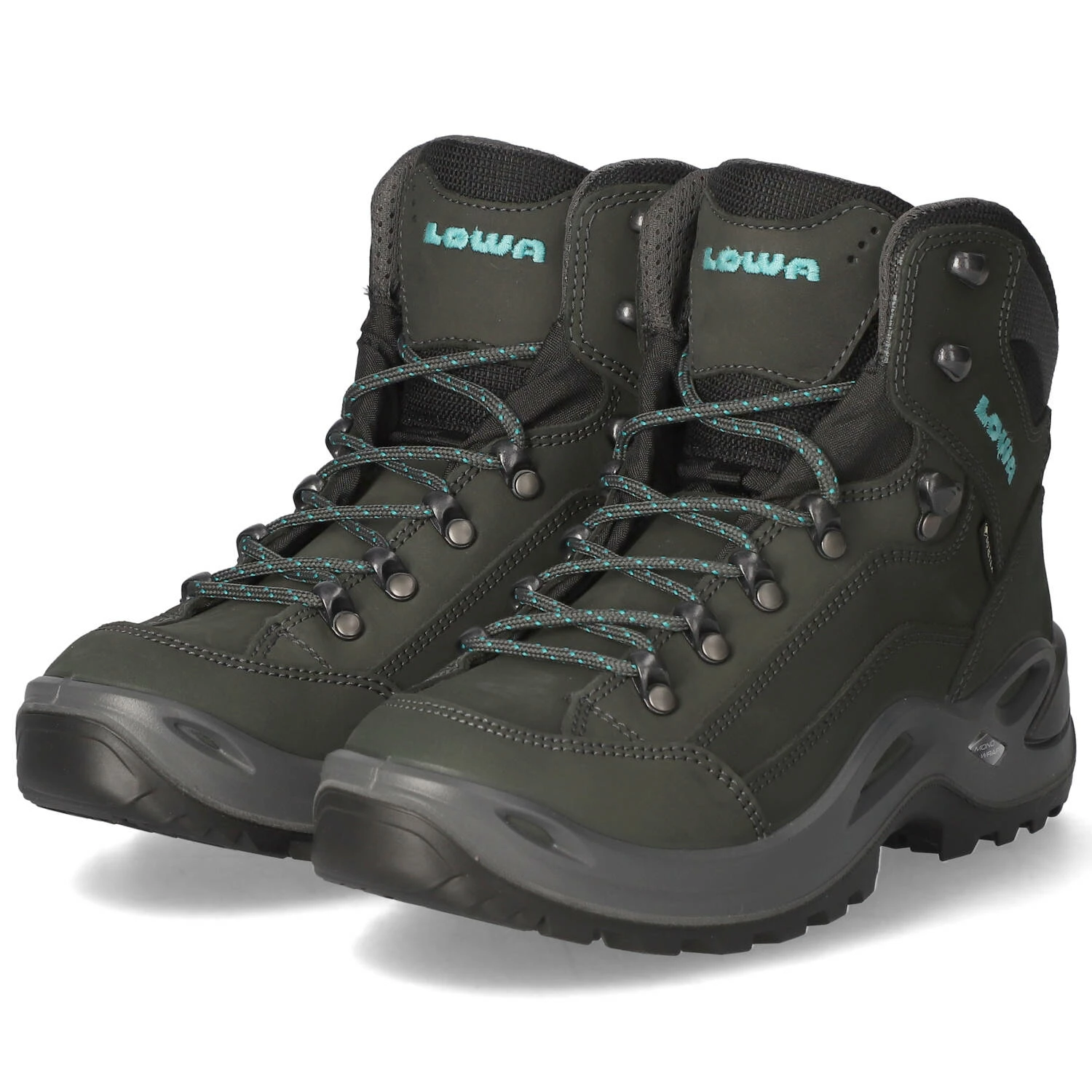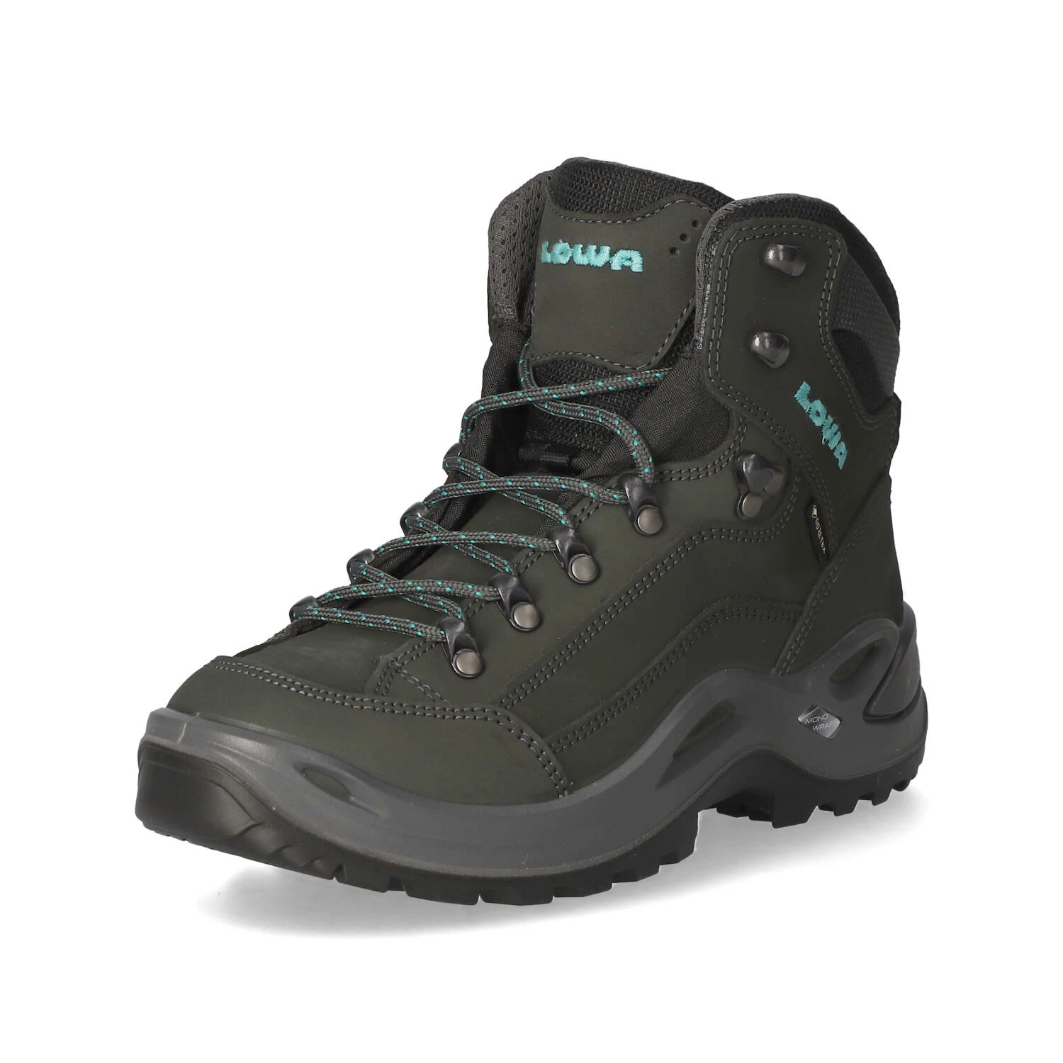 Lowa Damen Outdoorschuhe/ Wanderschuhe/ Trekkingschuhe RENEGADE Grün/Grau Rauleder – wasserfest, atmungsaktiv (Gore-Tex) – sportliches Design – türkise Highlights – Schnürung – verstärkter Fußrahmen – Anziehlasche – gepolsterter Einstieg – leichtes Textilfutter – gepolstertes Wechselfußbett – flexible, rutschhemmende Profilsohle