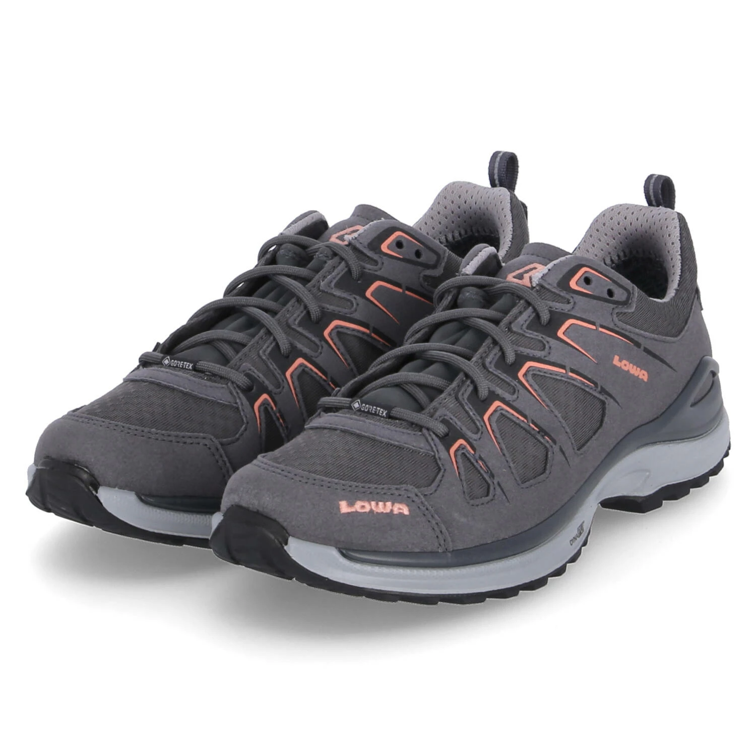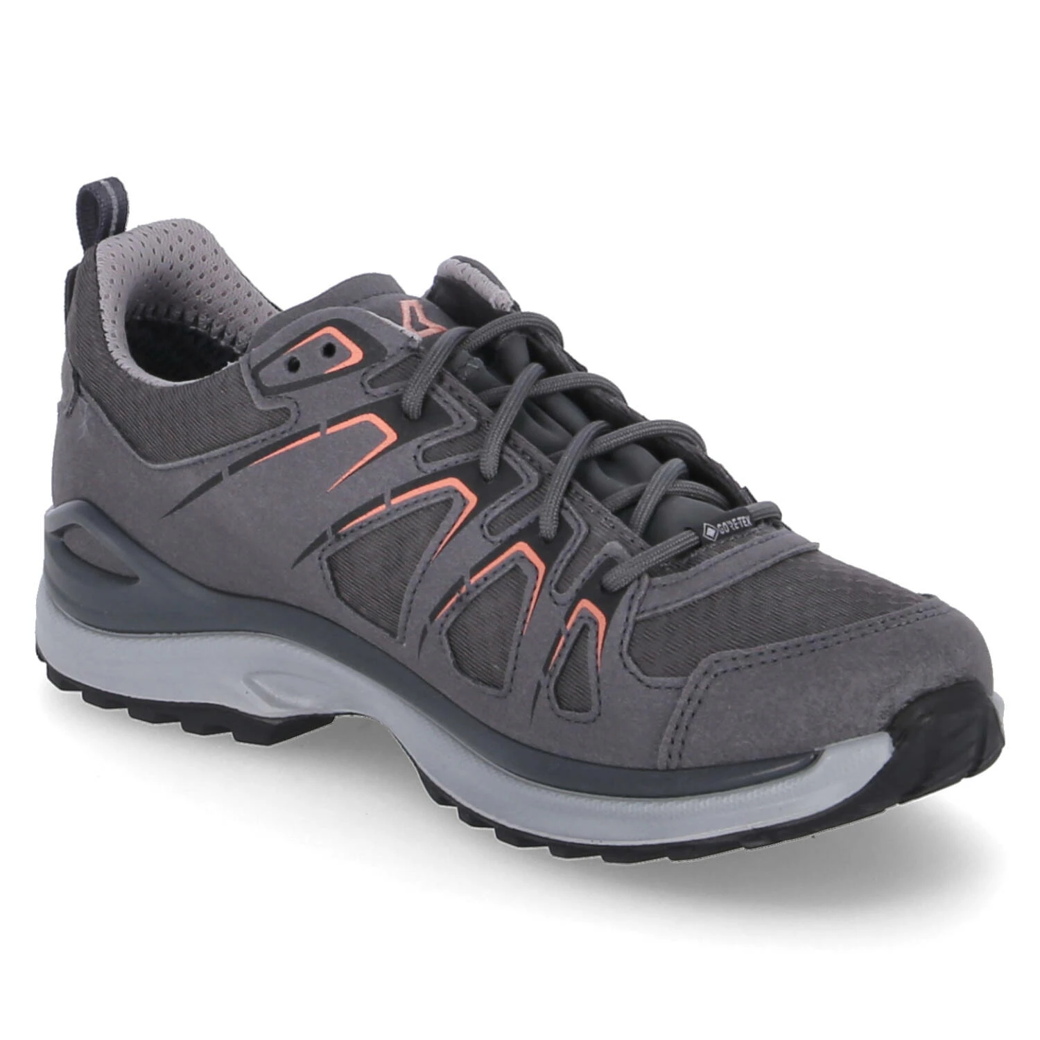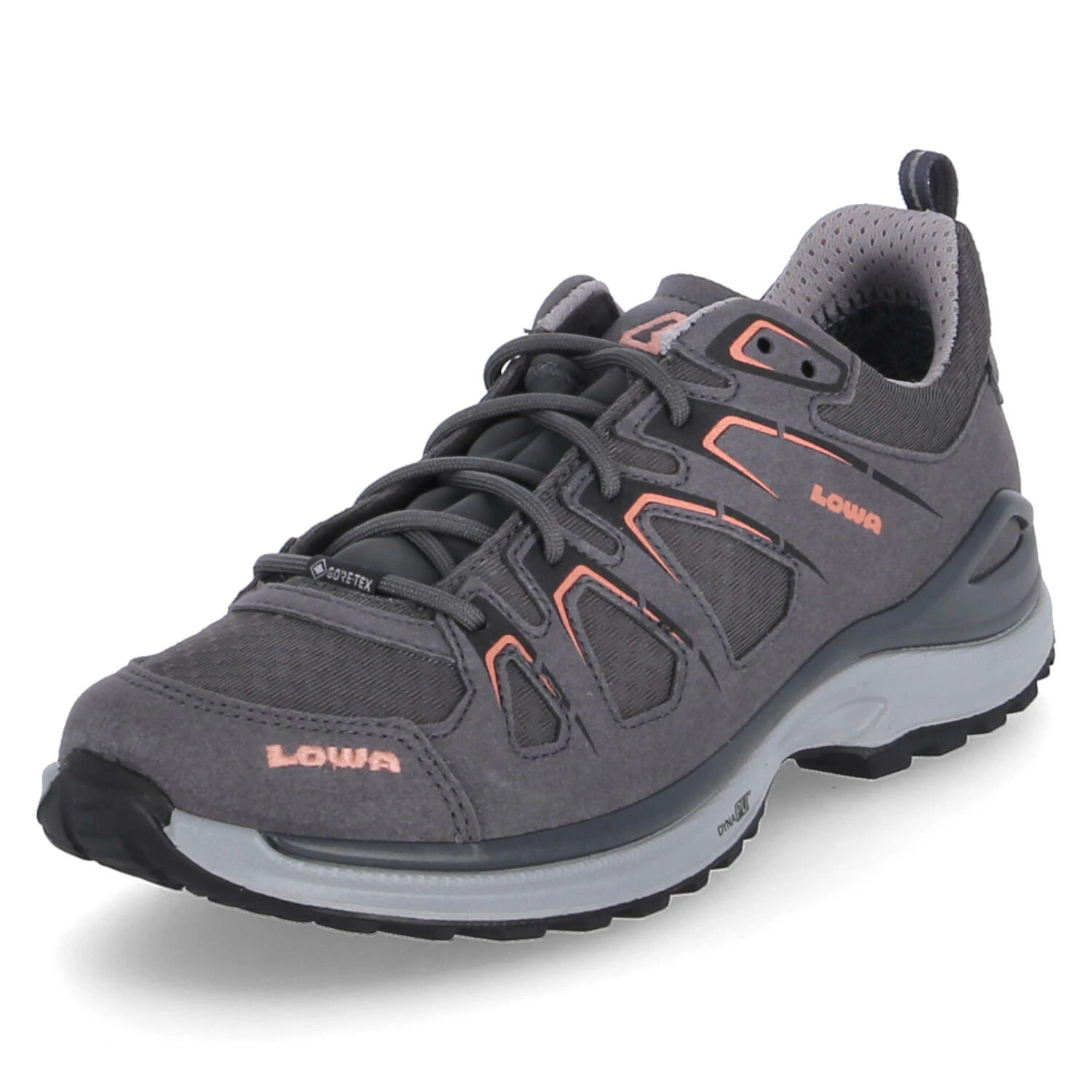 Lowa Damen Outdoorschuhe/ Trailrunningschuhe INNOX EVO GTX LO Grau Textil-Synthetik-Mix – wasserfest, winddicht und atmungsaktiv (GORE-TEX) – Schnürverschluss – Anziehlasche – sportlichen Zierstreifen – gepolsterter Einstieg – verstärkter Fersen- und Zehenbereich – dezente Markendetails – gepolstertes Wechselfußbett – angenehmes Textilfutter – flexible, rutschhemmende „DynaPU“-Profilsohle
