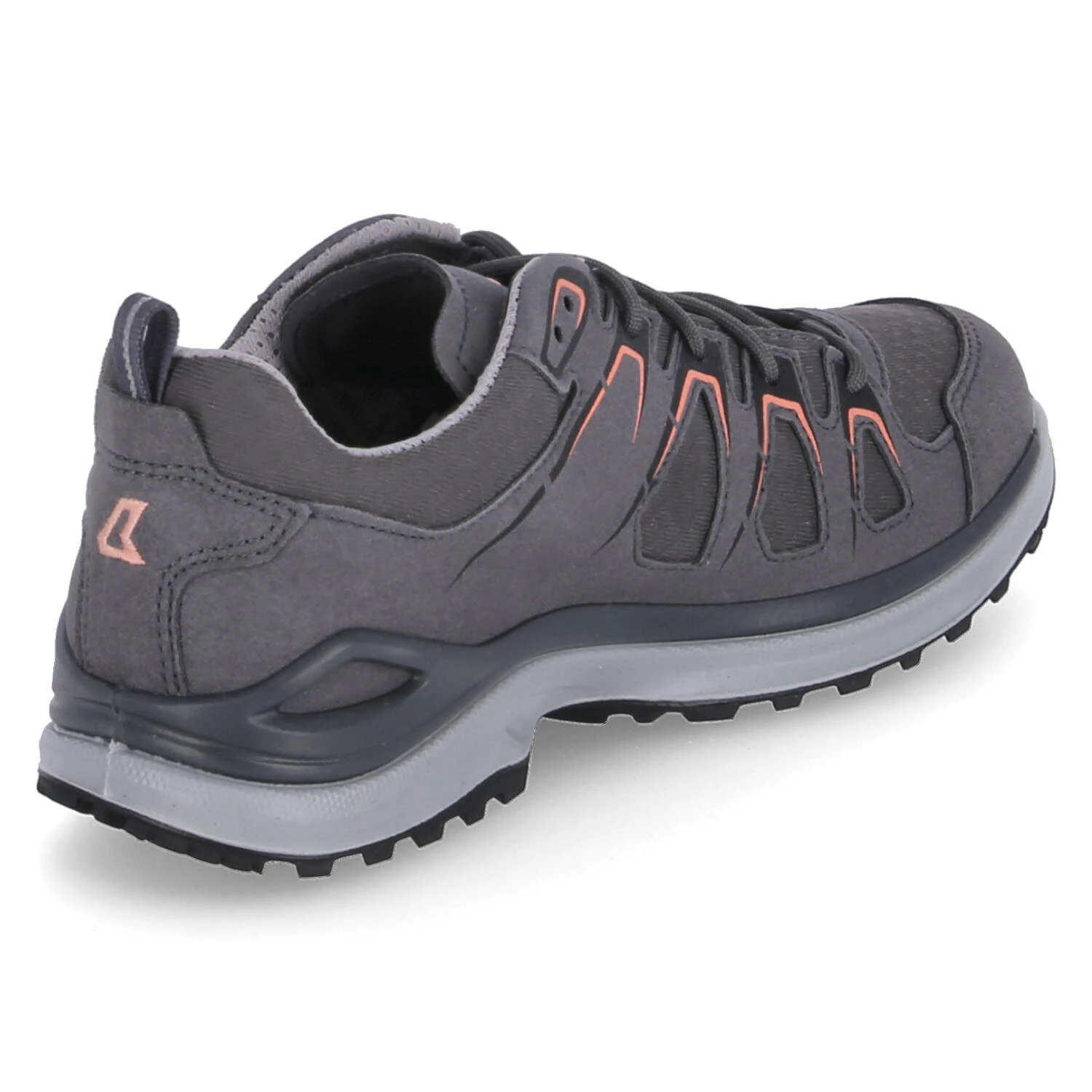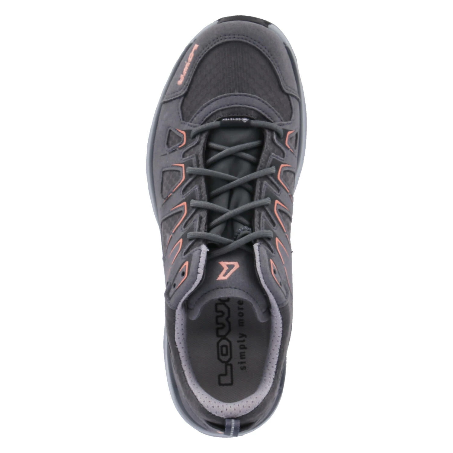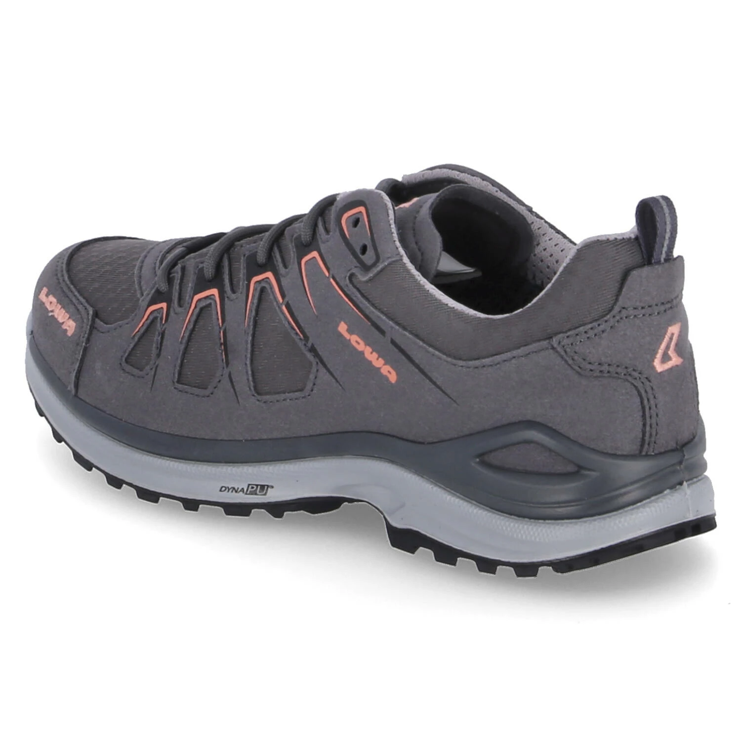 Lowa Damen Outdoorschuhe/ Trailrunningschuhe INNOX EVO GTX LO Grau Textil-Synthetik-Mix – wasserfest, winddicht und atmungsaktiv (GORE-TEX) – Schnürverschluss – Anziehlasche – sportlichen Zierstreifen – gepolsterter Einstieg – verstärkter Fersen- und Zehenbereich – dezente Markendetails – gepolstertes Wechselfußbett – angenehmes Textilfutter – flexible, rutschhemmende „DynaPU“-Profilsohle