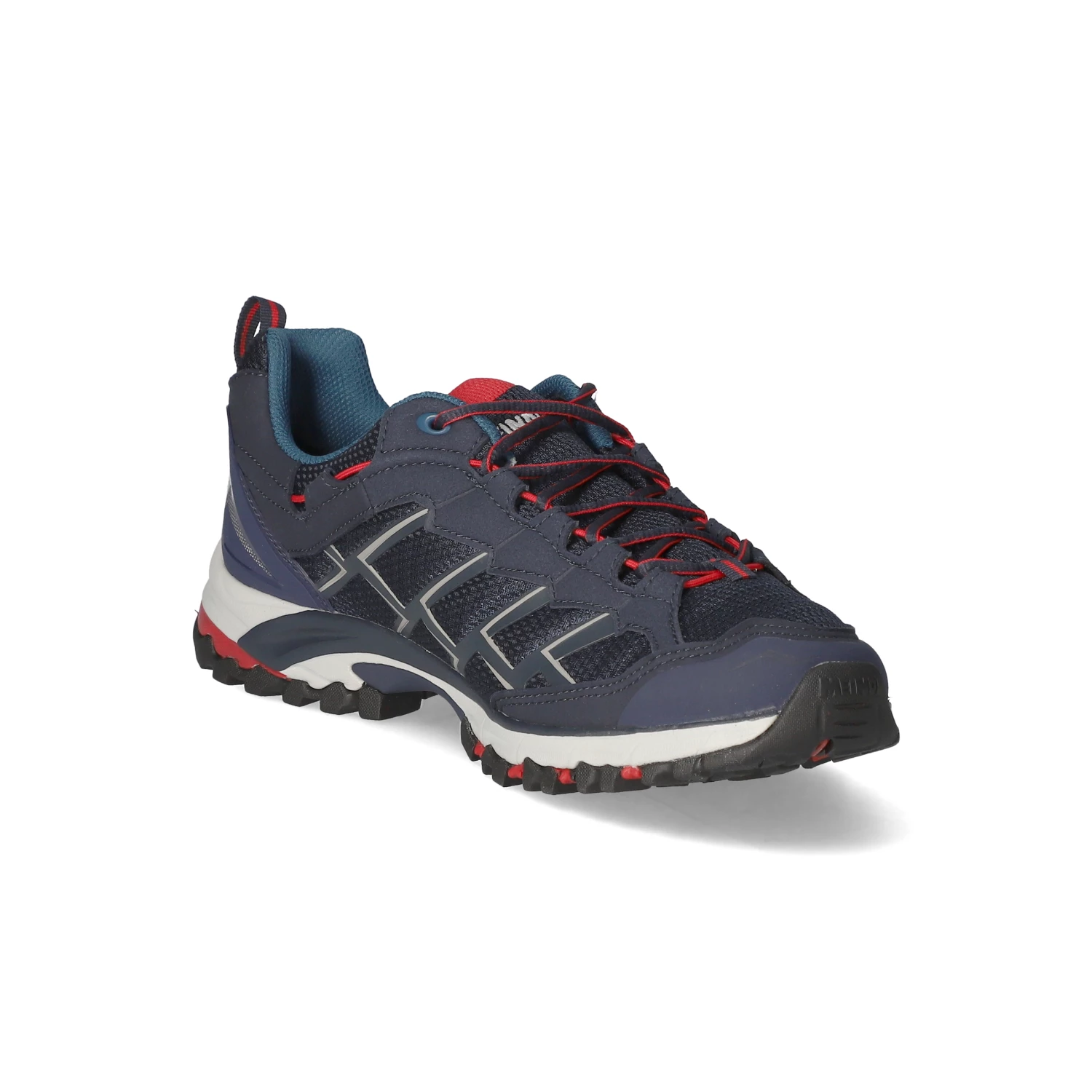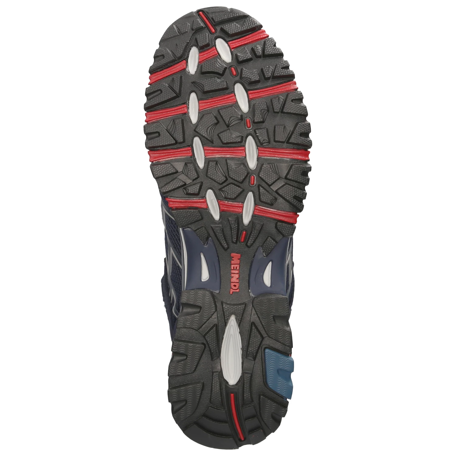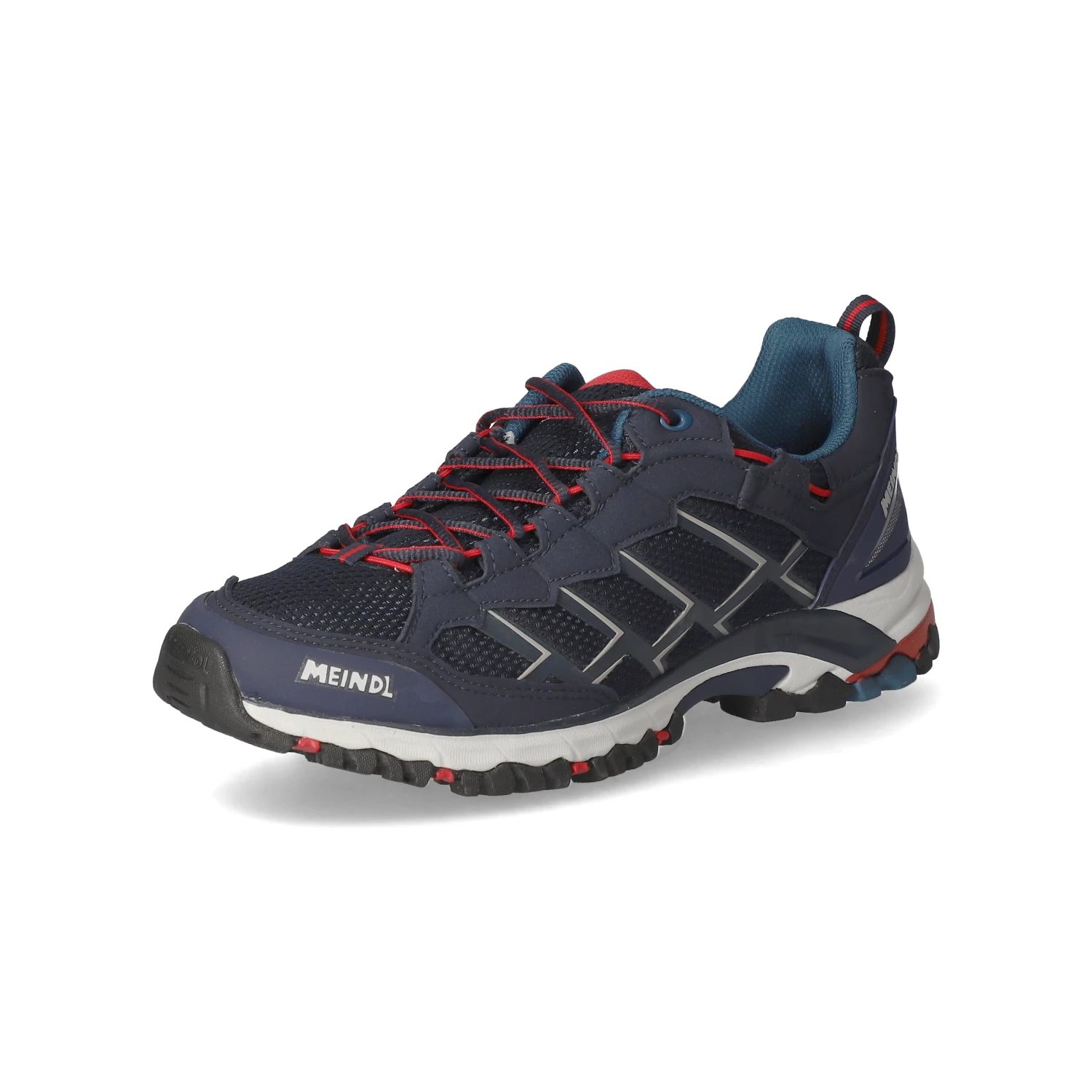 Meindl Herren Outdoorschuhe/ Wanderschuhe CARIBE Blau Textil – sportliches Design – rote und graue Highlights – Schnürung – verstärkter Zehen- und Fersenbereich – Anziehlasche – gepolsterter Einstieg – leichtes Textilfutter – gepolstertes Wechselfußbett – flexible, rutschhemmende Profilsohle
