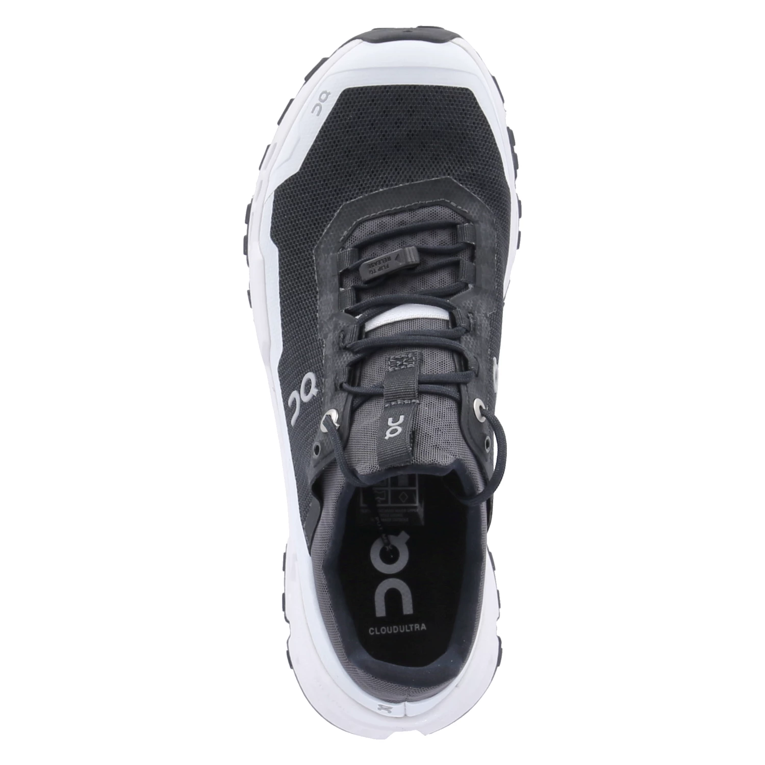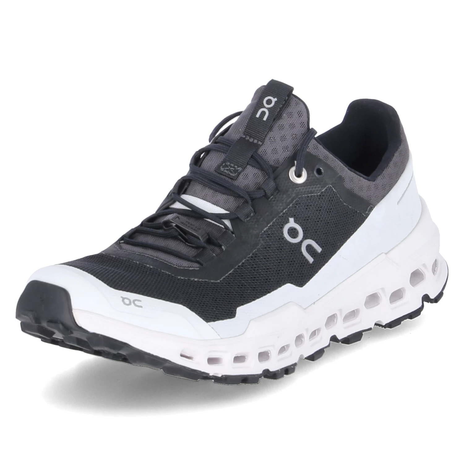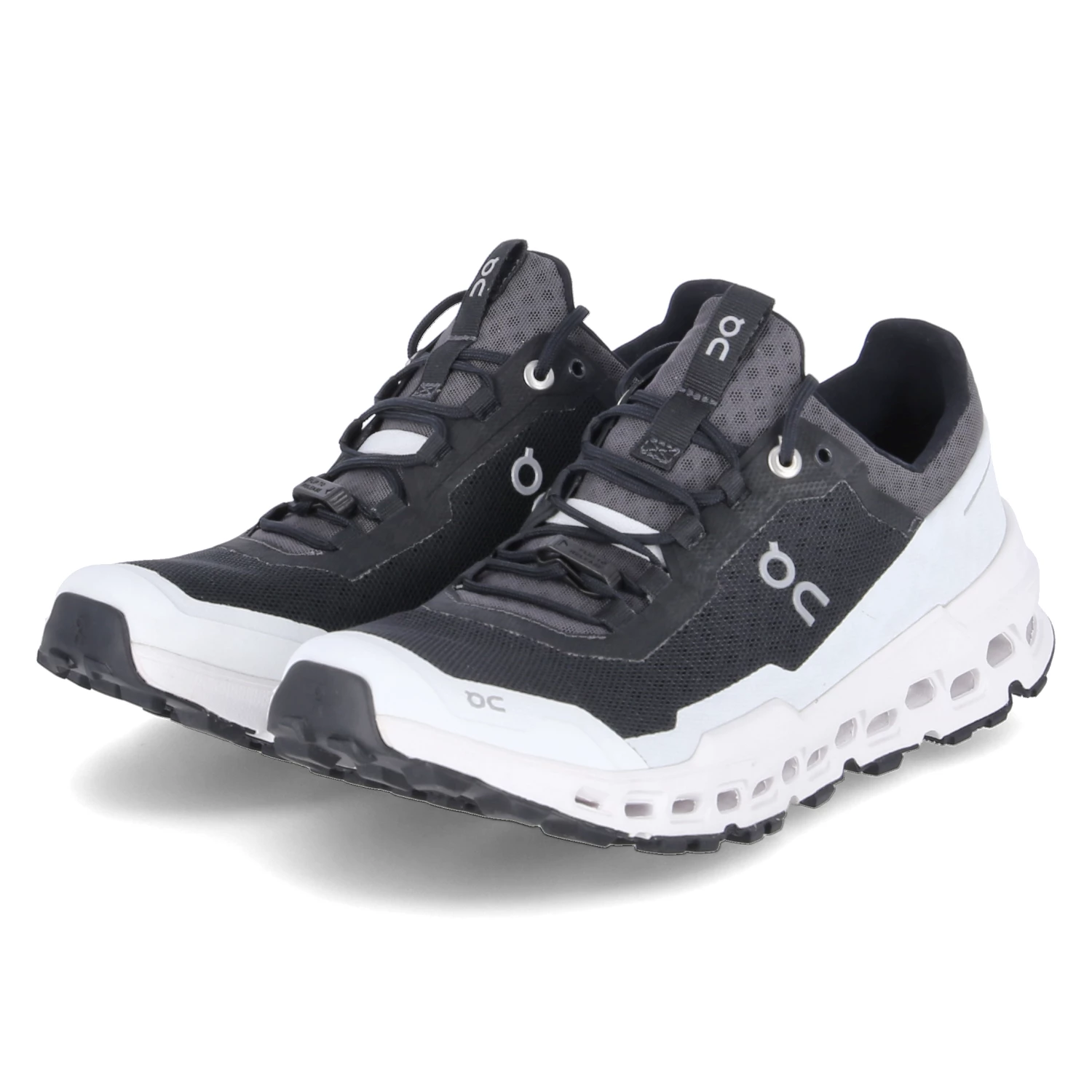 On Damen Low Sneaker/ Sportschuhe CLOUDULTRA Schwarz Textil-Synthetik-Mix – sportliches Design – typische Markendetails – Schnürung mit FlipRelease Tool (zur Anpassung der Weite) – Teile aus Mesh – verstärkter Zehen- und Fersenbereich – leicht gepolsterter Einstieg – leichtes Textilfutter – gepolsterte Wechseldecksohle – flexible, rutschhemmende Profilsohle – uniquer Style
