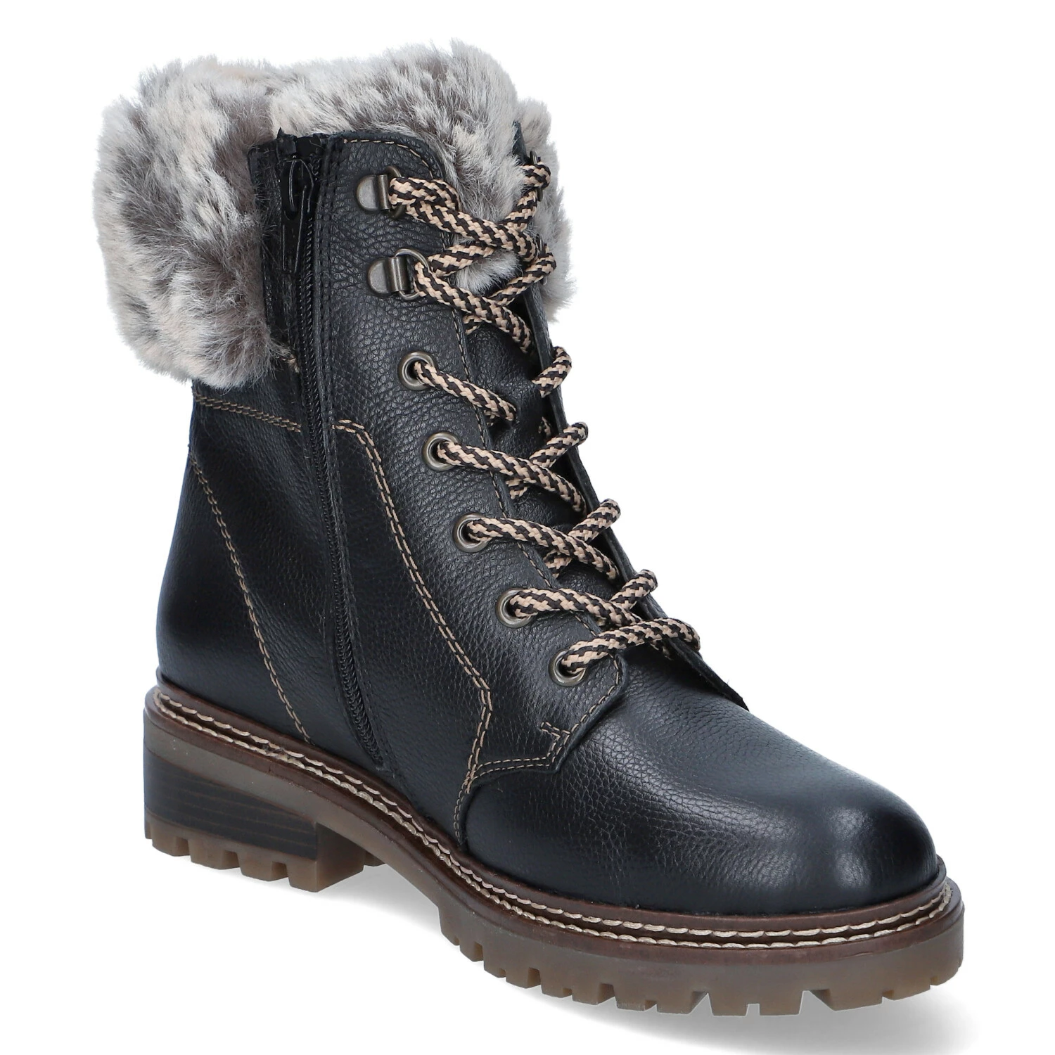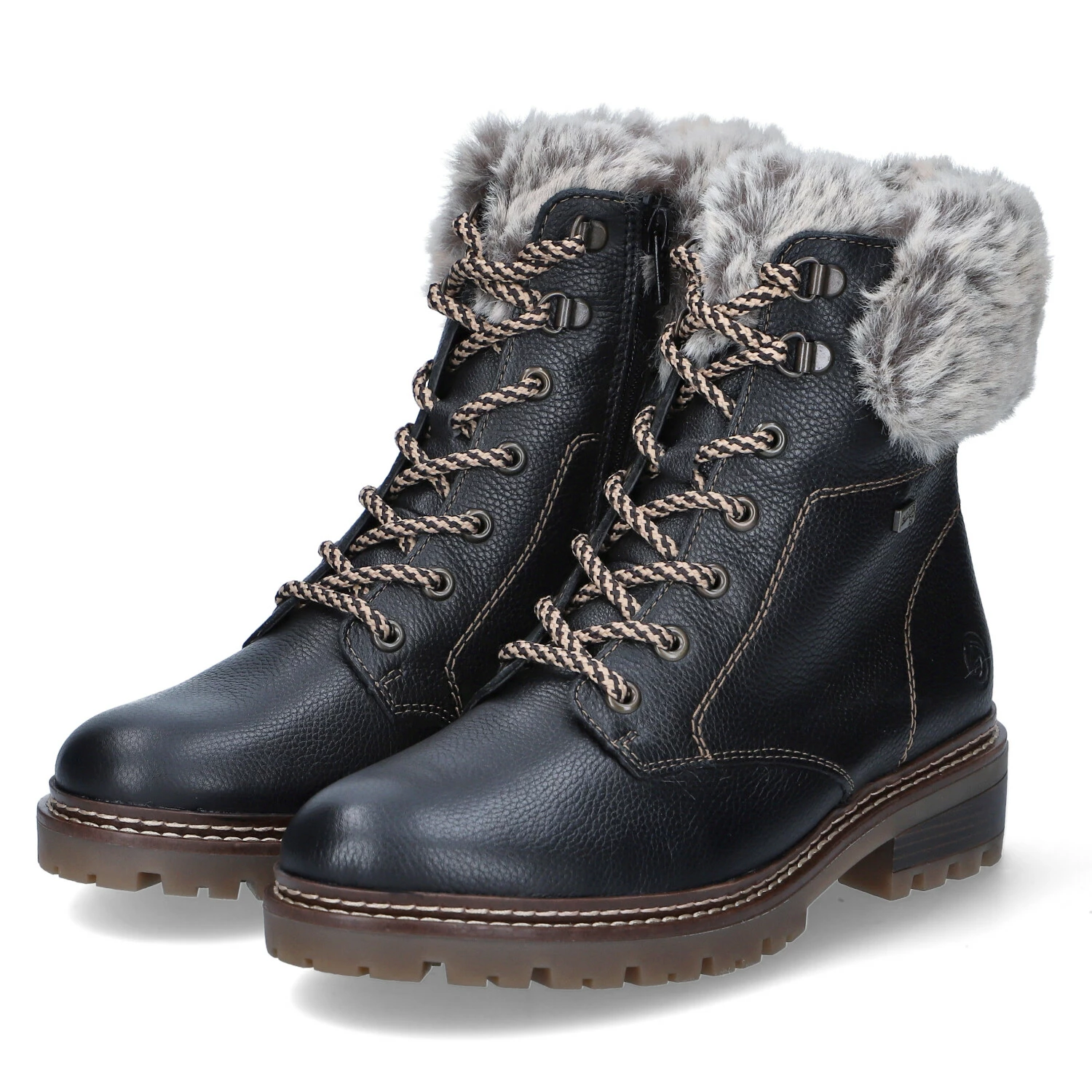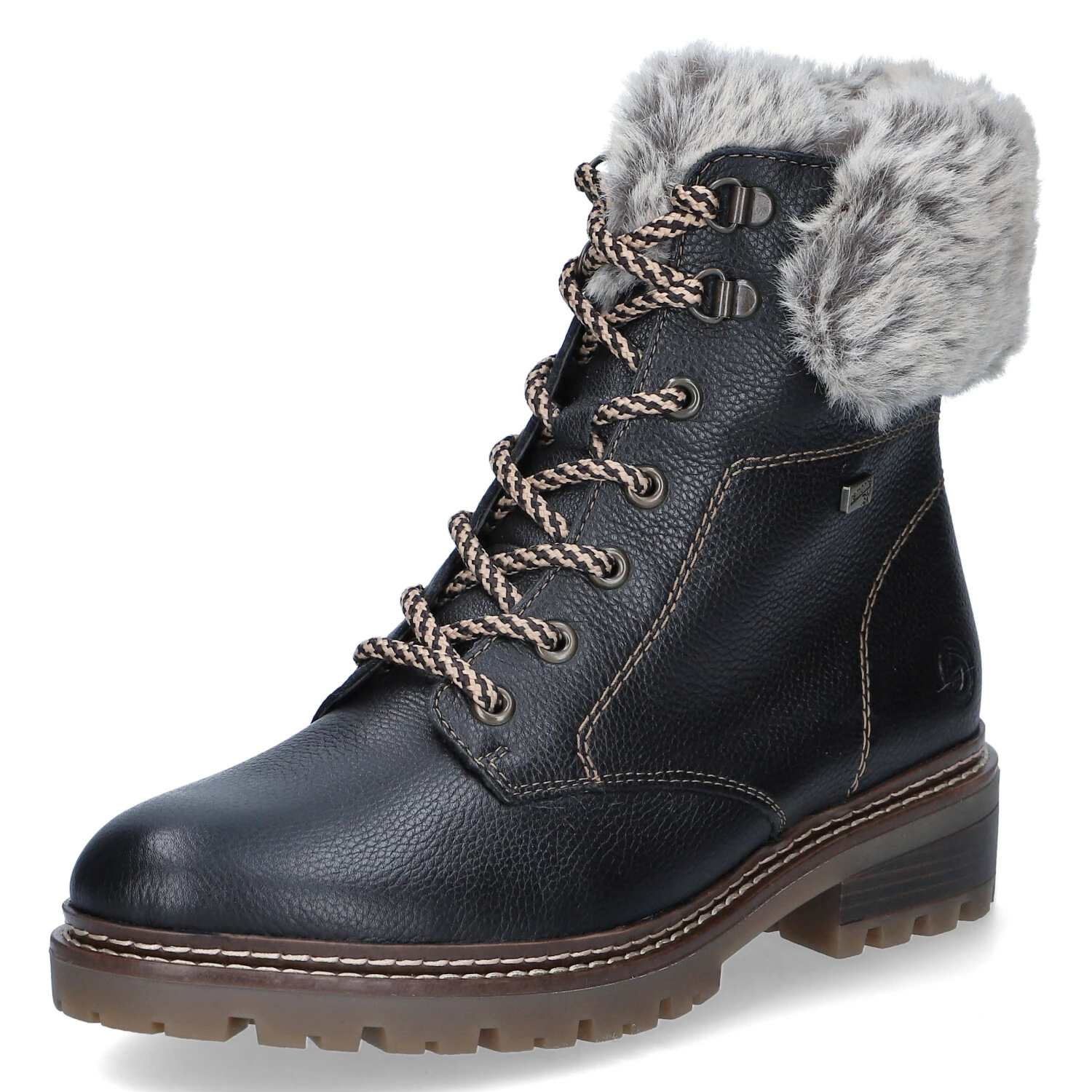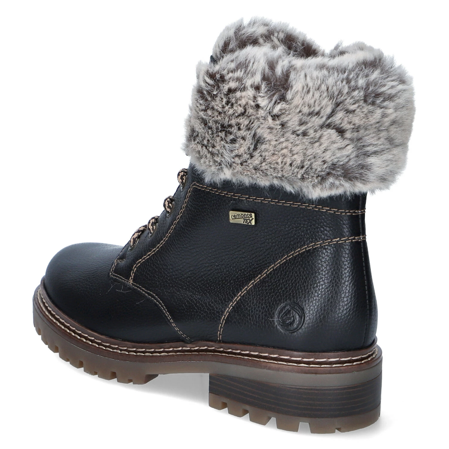 Remonte Damen Stiefeletten/ Schnürstiefeletten Schwarz Leder-Textil-Mix – wasserfest und winddicht (RemonteTEX) – Schnürung – Reißverschluss – dezent Markendetails – verstärkter Fersenbereich – warmes Textilfutter – Ziernähte -gepolsterte Wechseldecksohle – stabile, rutschhemmende Profilsohle – Blockabsatz