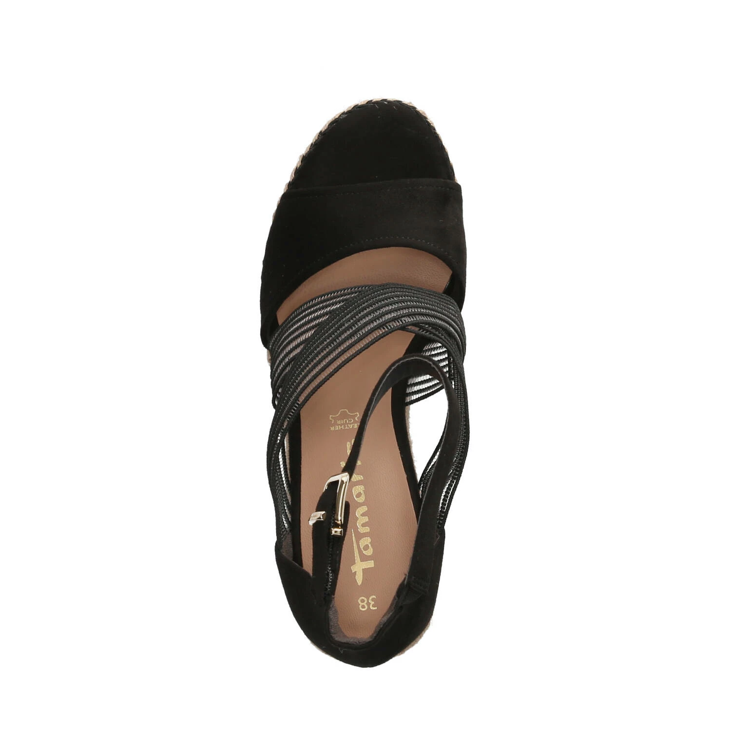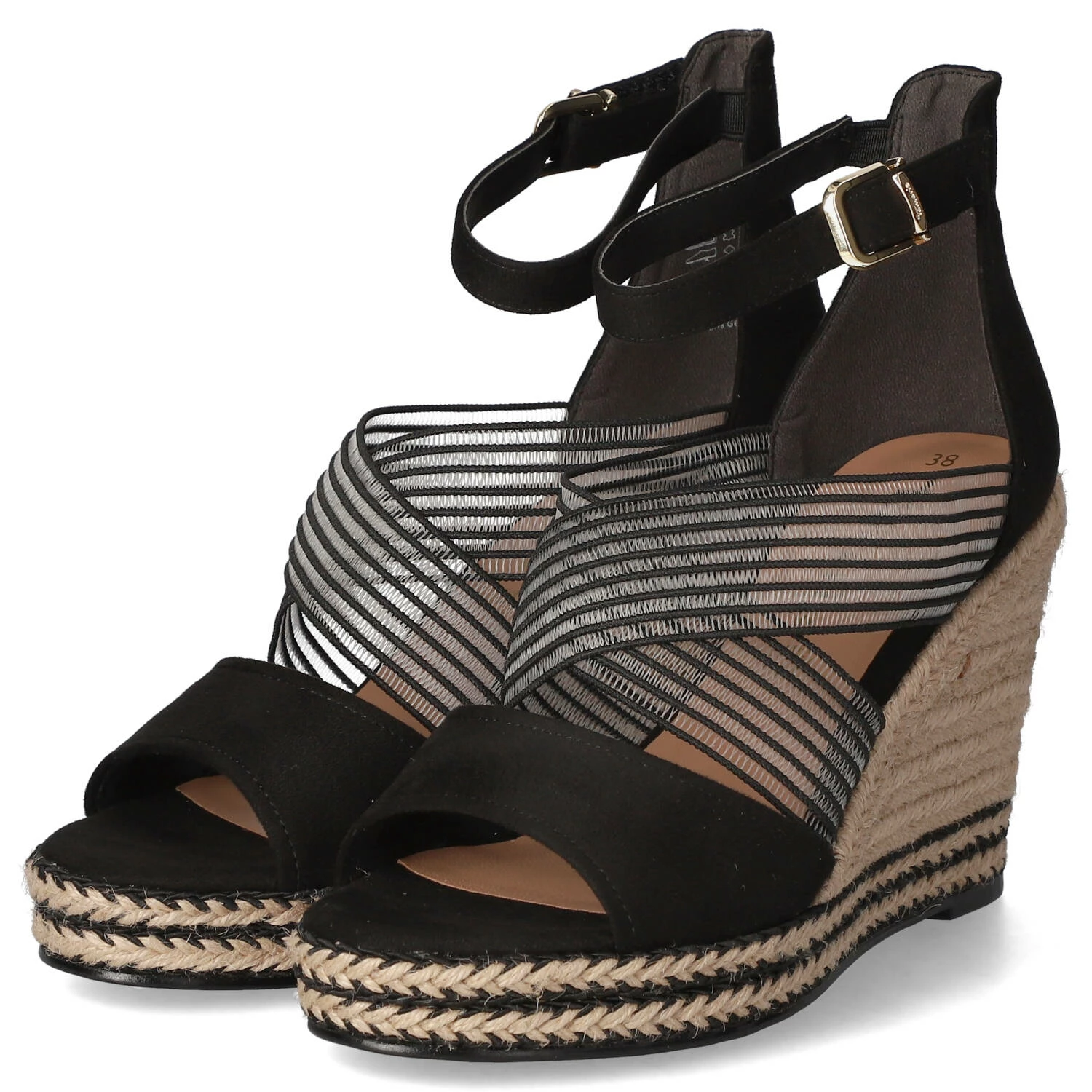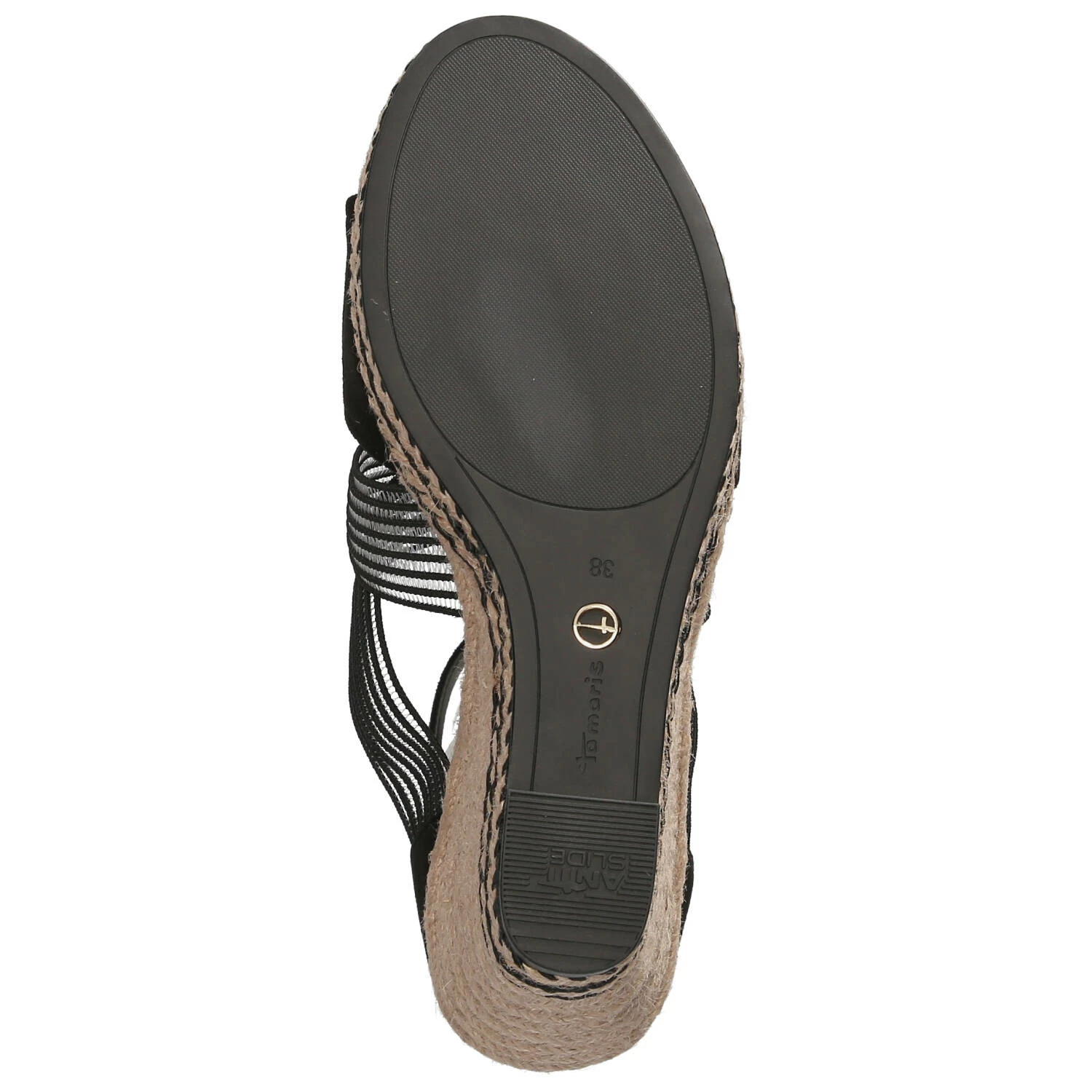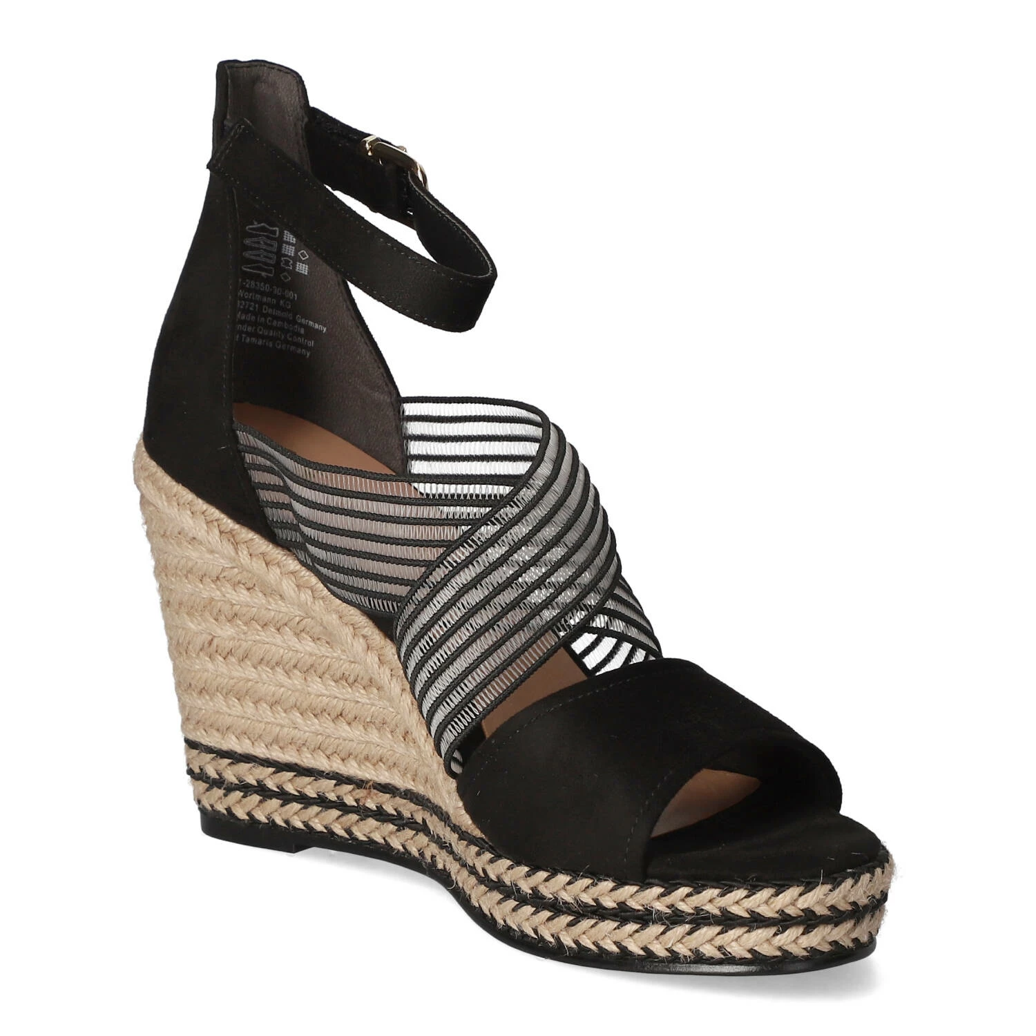 Tamaris Damen Sandaletten/ Keilsandaletten Schwarz Textil – modisch gekreuzte Elastikriemen – Knöchelriemen mit Klettverschluss – gepolsterte Decksohle – robuste, rutschhemmende Laufsohle mit leichtem Profil – stabiler Keilabsatz in Flechtoptik