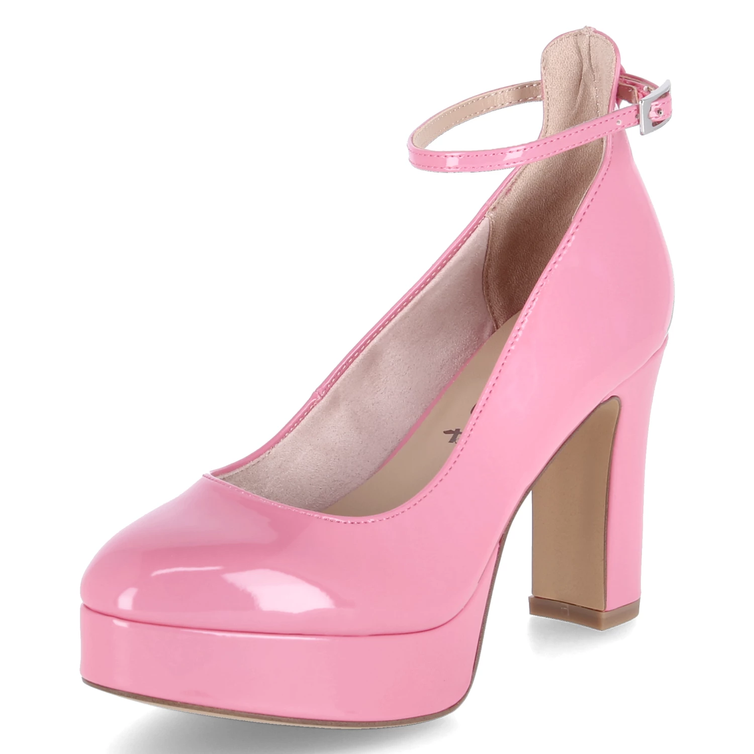 Tamaris Damen Plateau-Pumps Rosa Synthetik – Lackoberfläche – vegan – ca. 10 cm hoher Blockabsatz – Plateauhöhe ca. 3 cm – gepolstertes Fußbett – Knöchelriemen mit Schnalle und Elastikeinsatz