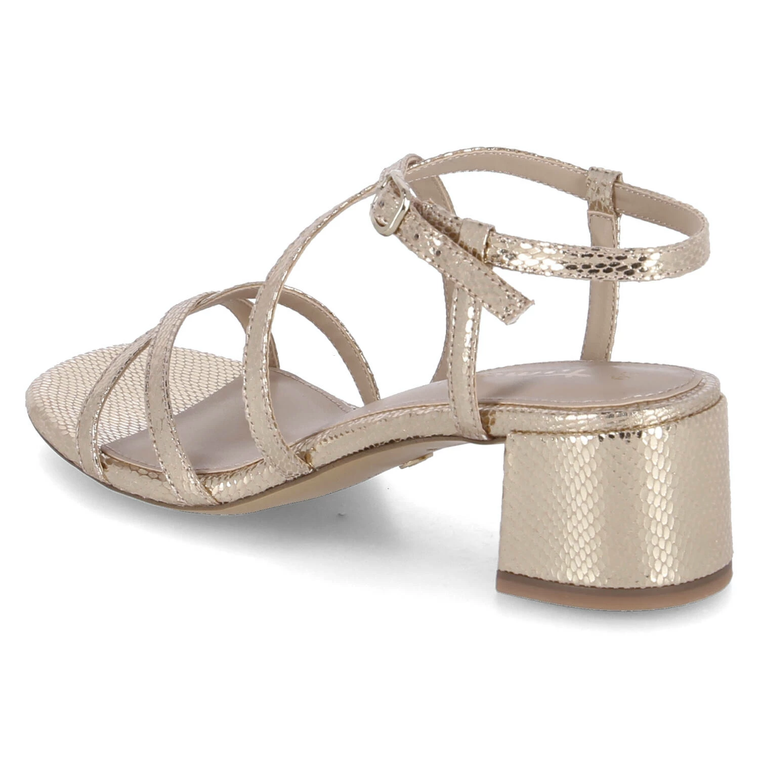 Tamaris Damen Sandalen/ Sandaletten Gold Textil – vegan – Schnalle mit Elastikeinsatz – schmale Riemchen – gepolsterte Decksohle – rutschhemmende Laufsohle – fein strukturierter Print – stabiler Blockabsatz