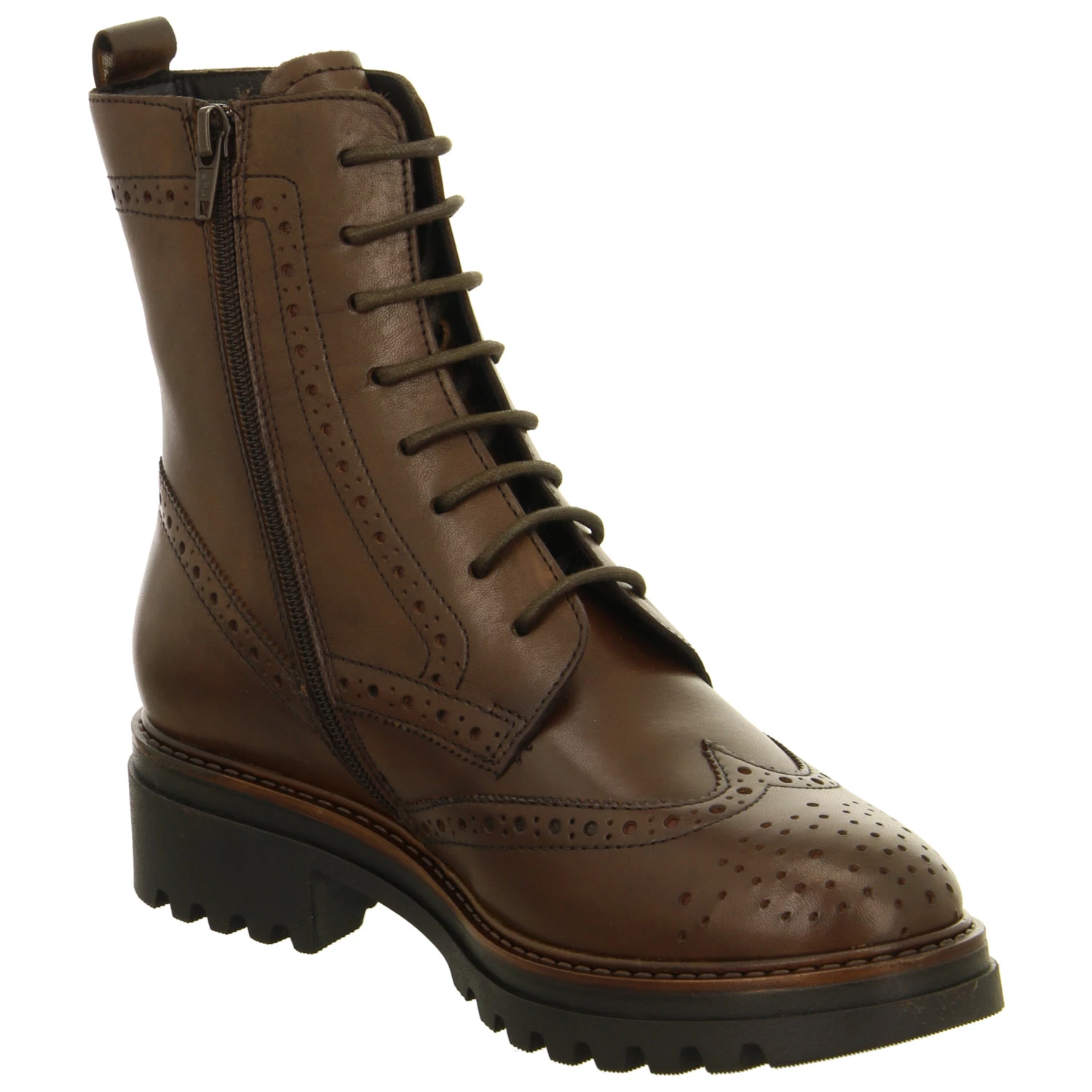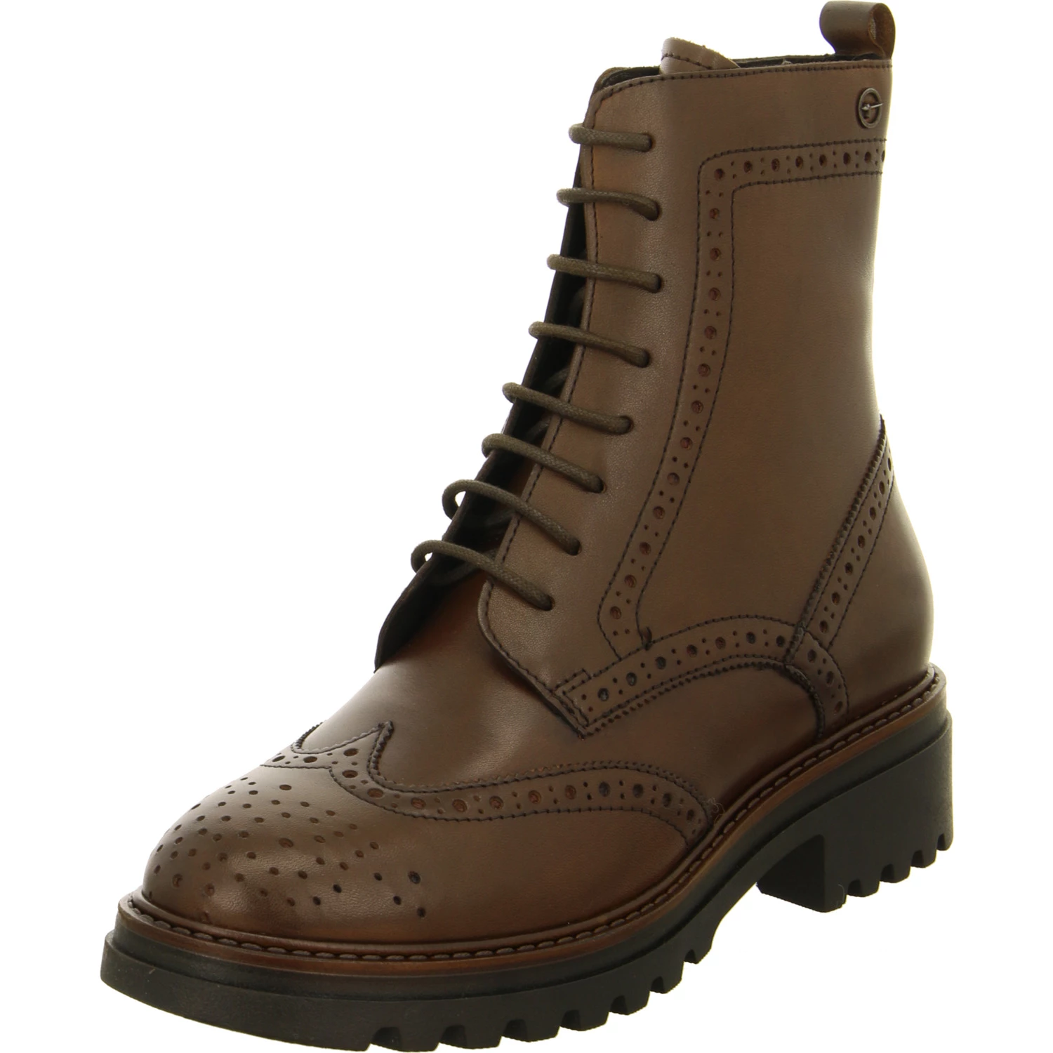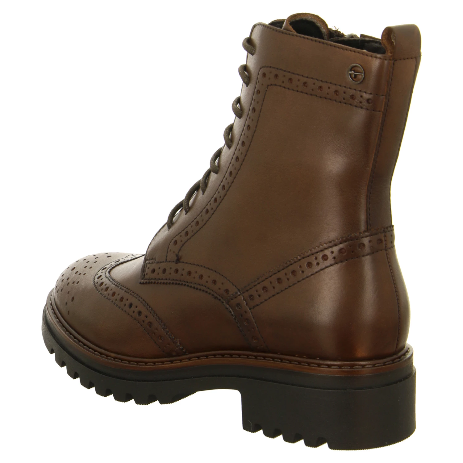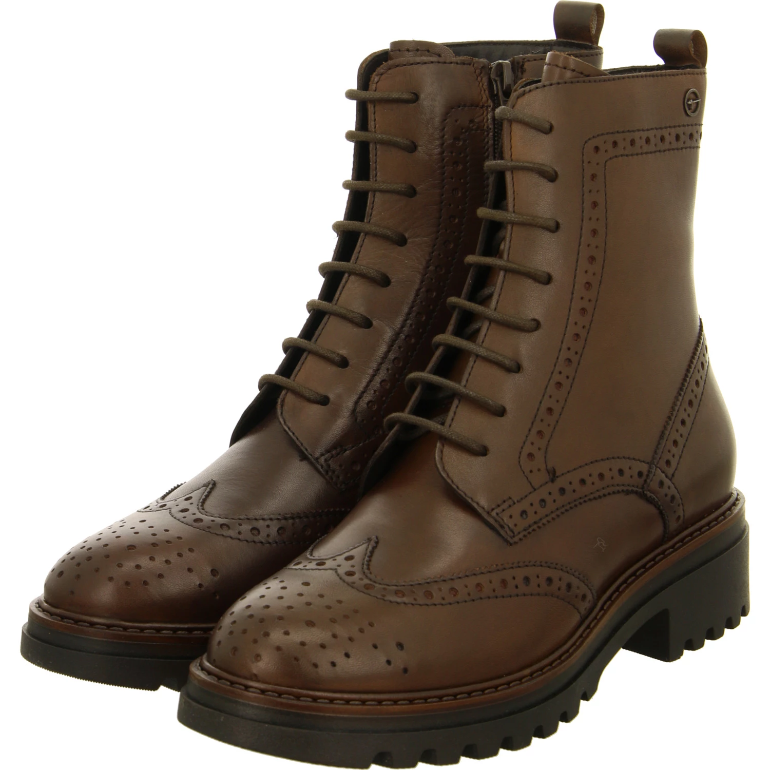 Tamaris Damen Stiefeletten/ Schnürstiefeletten Braun Glattleder – Schnürung und Reißverschluss – leichtes Futter für kühle Tage – zum Teil angedeutete Lochstanzungen/ Budapester Lochmuster – verstärkter Fersenbereich – Anziehlasche – gepolsterte Decksohle – rutschhemmende Laufsohle mit Profil – ca. 4,5 cm Blockabsatz