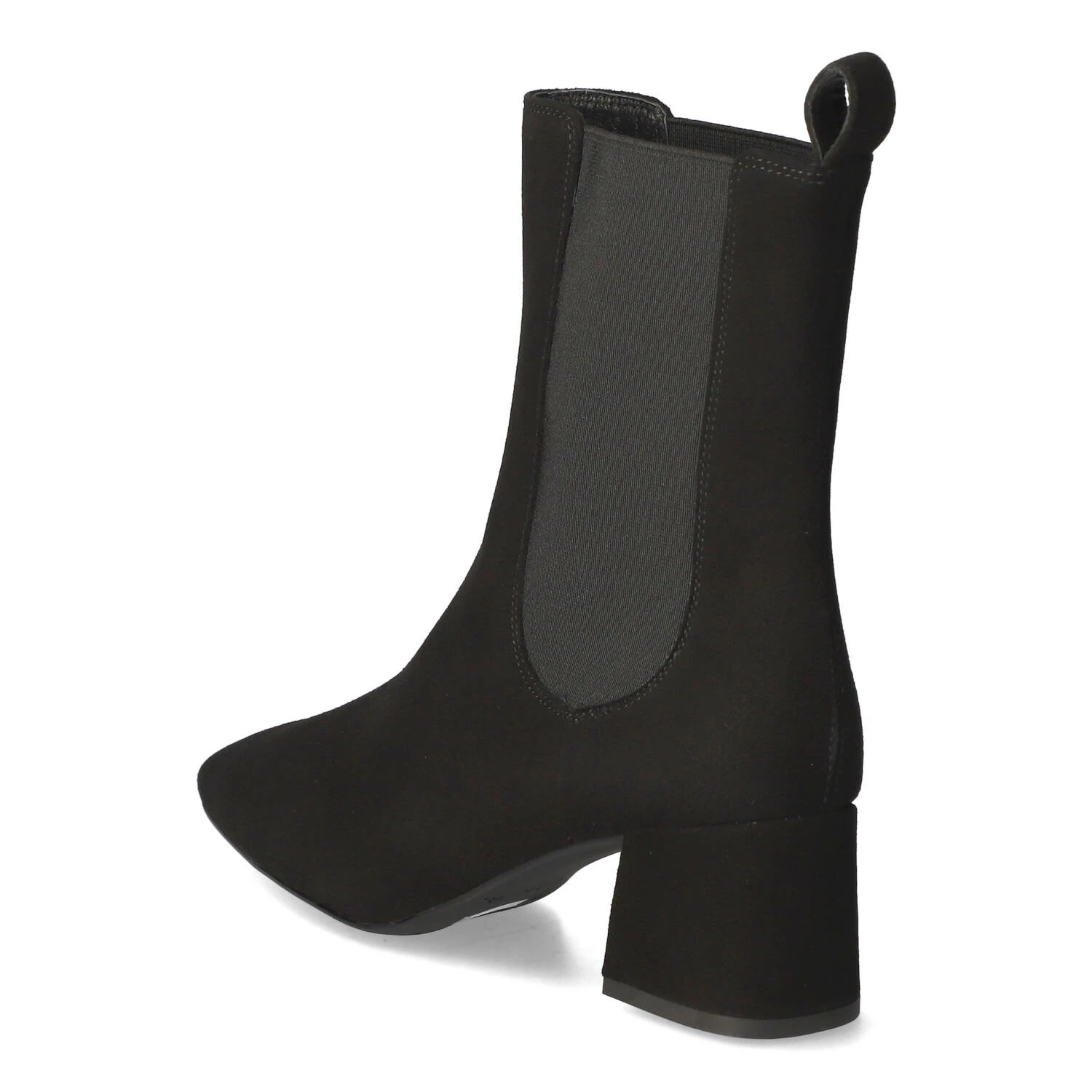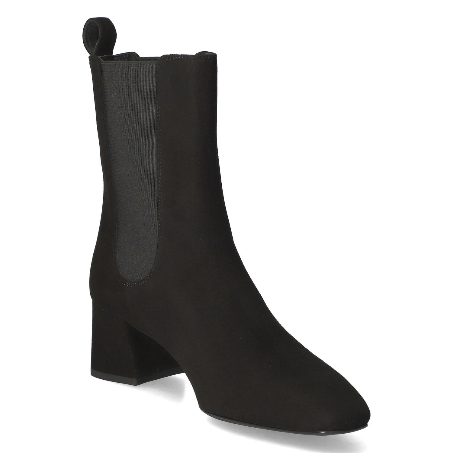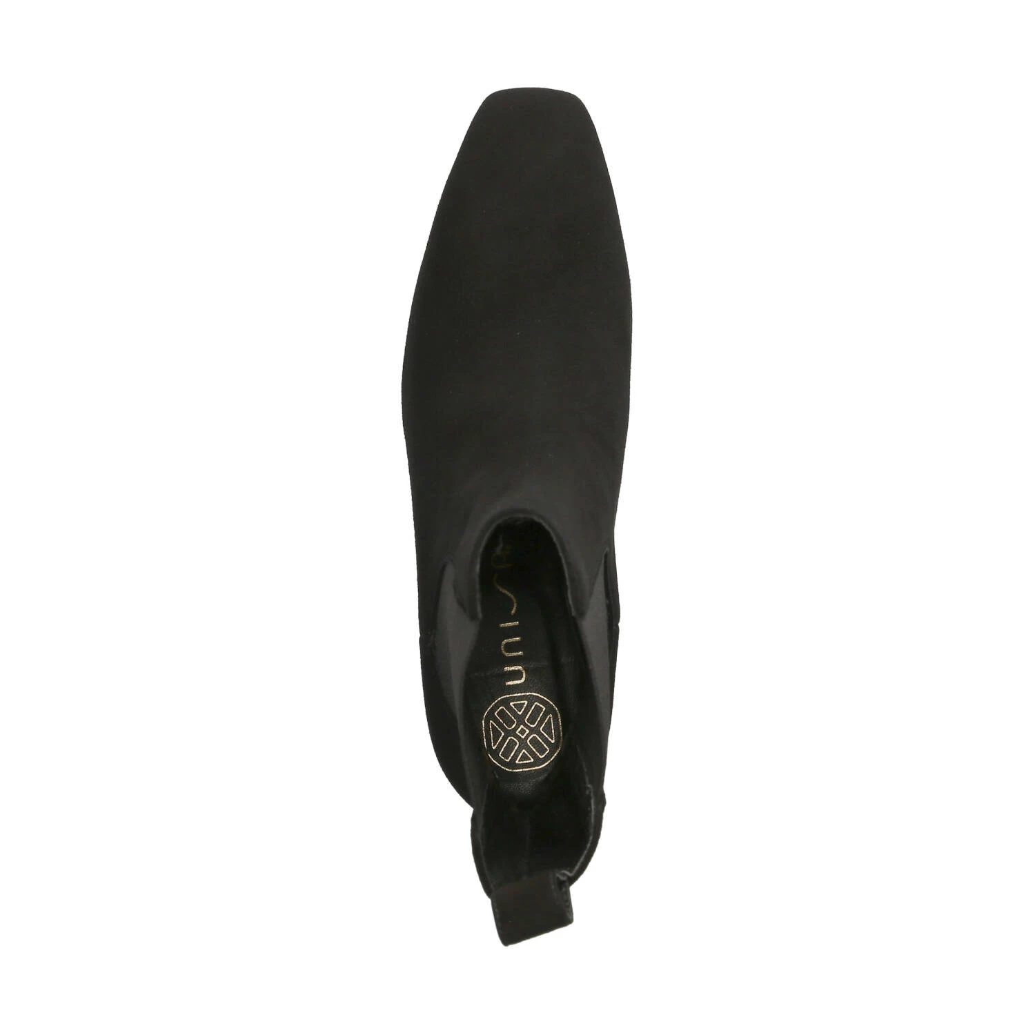Unisa Damen Chelsea Boots/ Stiefeletten LOZOYA Schwarz Rauleder-Textil-Mix – seitliche Elastikeinsätze am Schaft – Anziehlasche – angenehmes Leder-Textilfutter – dezent gepolsterte Lederdecksohle – flexible und rutschhemmende Laufsohle mit leichtem Profil – stabiler Blockabsatz